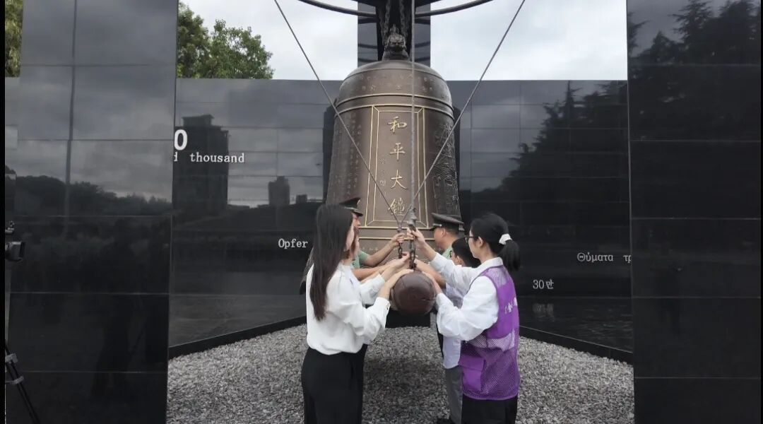 6名各界代表推动钟锤,共同撞响和平大钟3声。钟声回荡,寓意铭记历史、守望和平、开创未来。